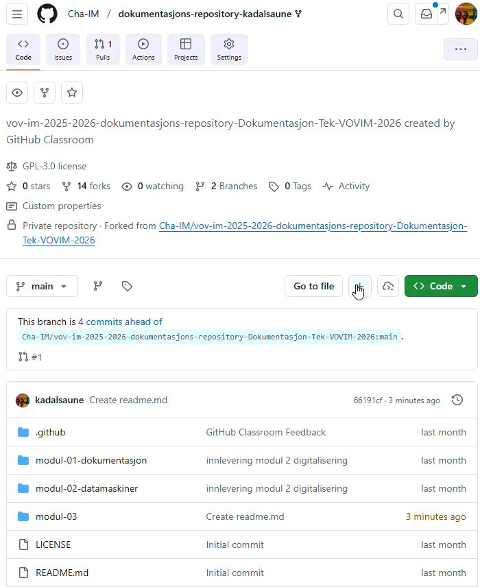 Lag en mappe i dokumentasjons-repoet ditt på Github som du kaller modul-04-nettverkslab/. I denne mappen lager du en fil som du kaller packet-tracer-dokumentasjon.md Lag også en undermappe som du kaller assets/. Hvis du har clonet repoet ditt til VS Code, kan du opprette mappene og filene direkte i Explorer-vinduet i VS Code. Hvis ikke kan du gjøre det direkte i github.com i nettleseren ved å klikke på +-tegnet ved siden av den grønne Code-knappen.